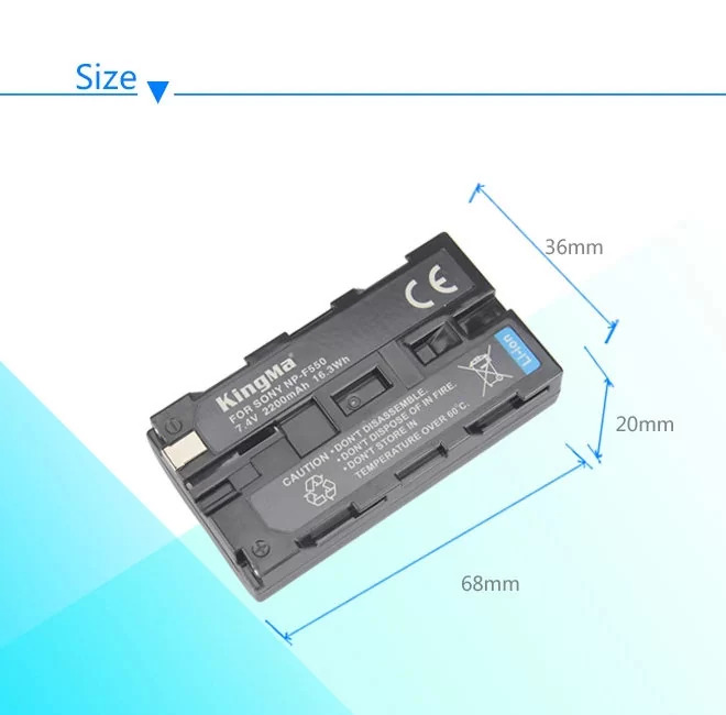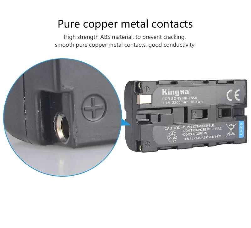- Легкий и прочный: Изготовленный из прочного АБС пластика, аккумулятор KINGMA NP-F550 обладает минимальным весом, что улучшает портативность и удобство использования в полевых условиях.