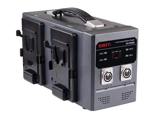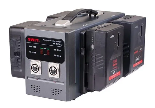 SWIT PC-P430S это зарядная станция для аккумуляторов V-Mount на 4 поста. Она также имеет два выхода 15В/6A XLR 4-пин, которые могут использоваться в качестве AC-DC адаптера.