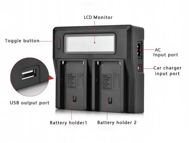 Probty NP-F Dual Battery Charger — это компактное двухканальное зарядное устройство с LCD-дисплеем, предназначенное для эффективной и безопасной зарядки аккумуляторов серии NP-F. Устройство подходит для таких моделей, как NP-F550, NP-F750, NP-F970 и других, обеспечивая одновременную зарядку двух батарей с возможностью контроля состояния каждой из них.