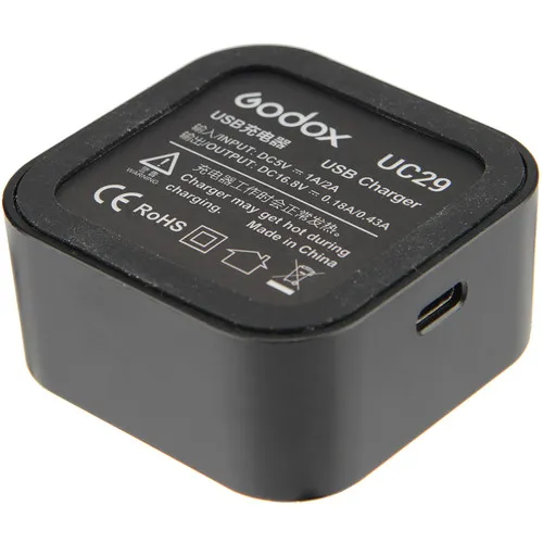 Godox UC29 - зарядное устройство для литий-ионного аккумулятора вспышек Godox серии AD200, включая запасной WB29.Через порт USB-C устройство подключается к источнику постоянного тока с напряжением 5 В, например к сетевому адаптеру VC1 или USB-порту компьютера. Обеспечивает выходное напряжение 16,8 В (0,18 А/0,43 A).Корпус устройства снабжен индикатором, который показывает степень заряда аккумулятора.