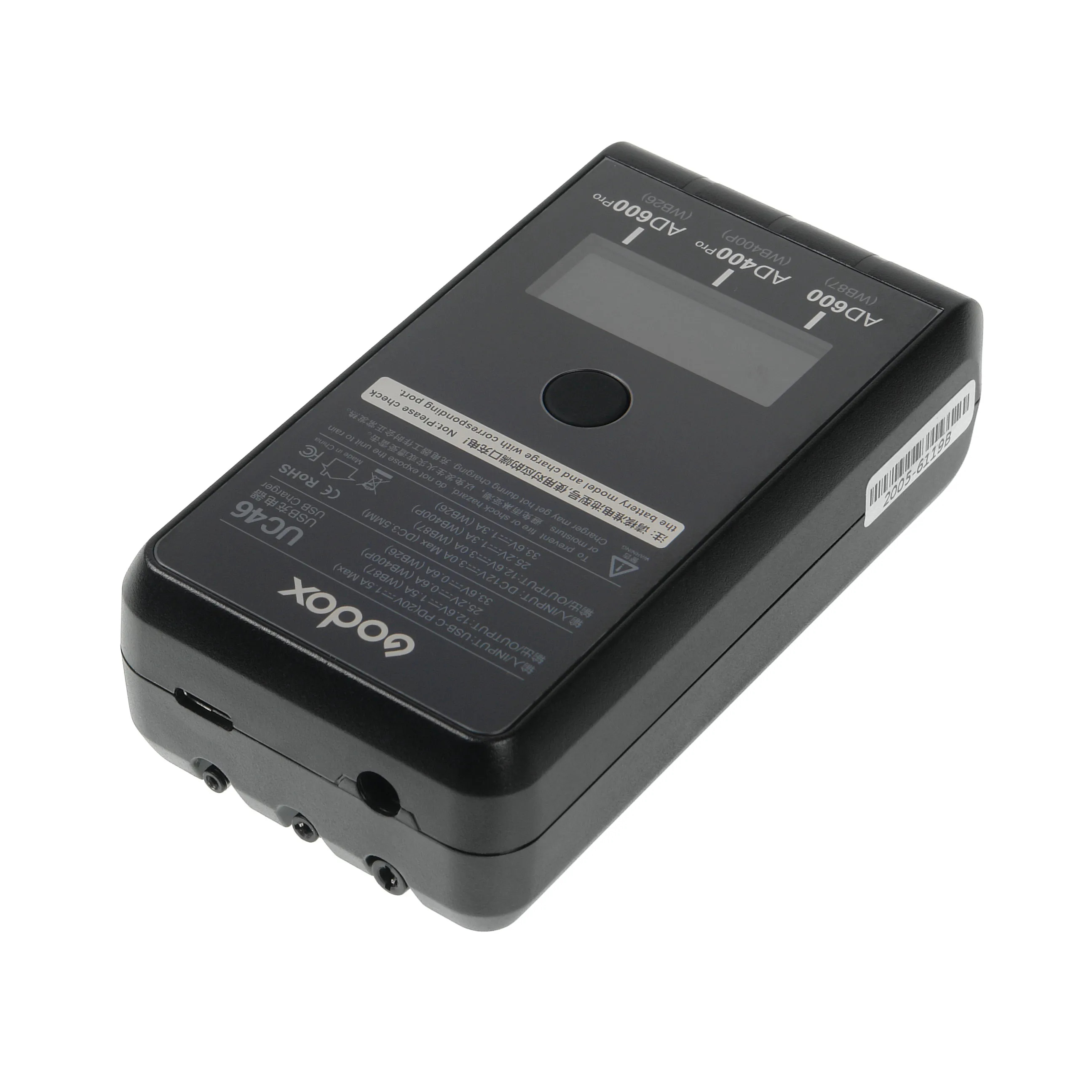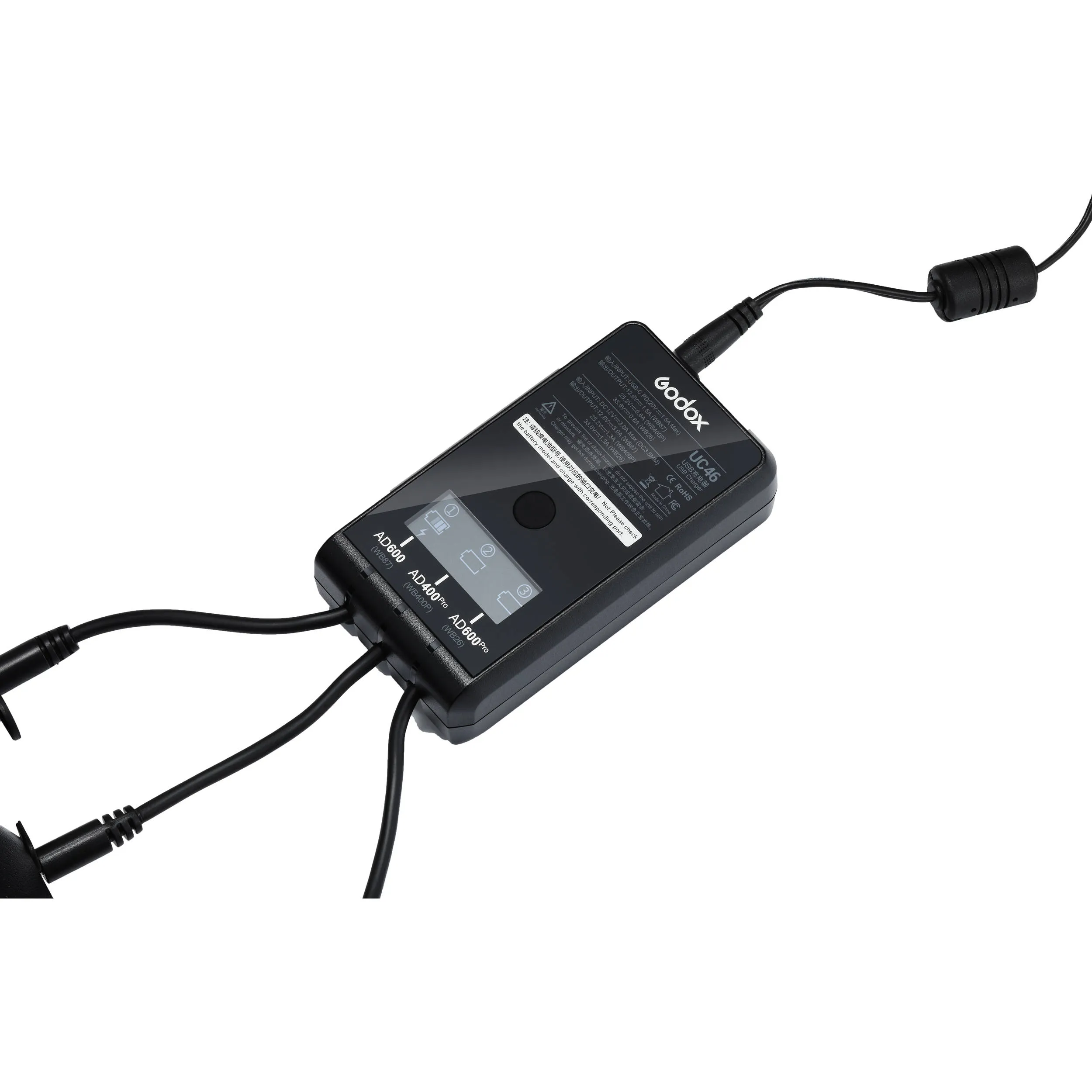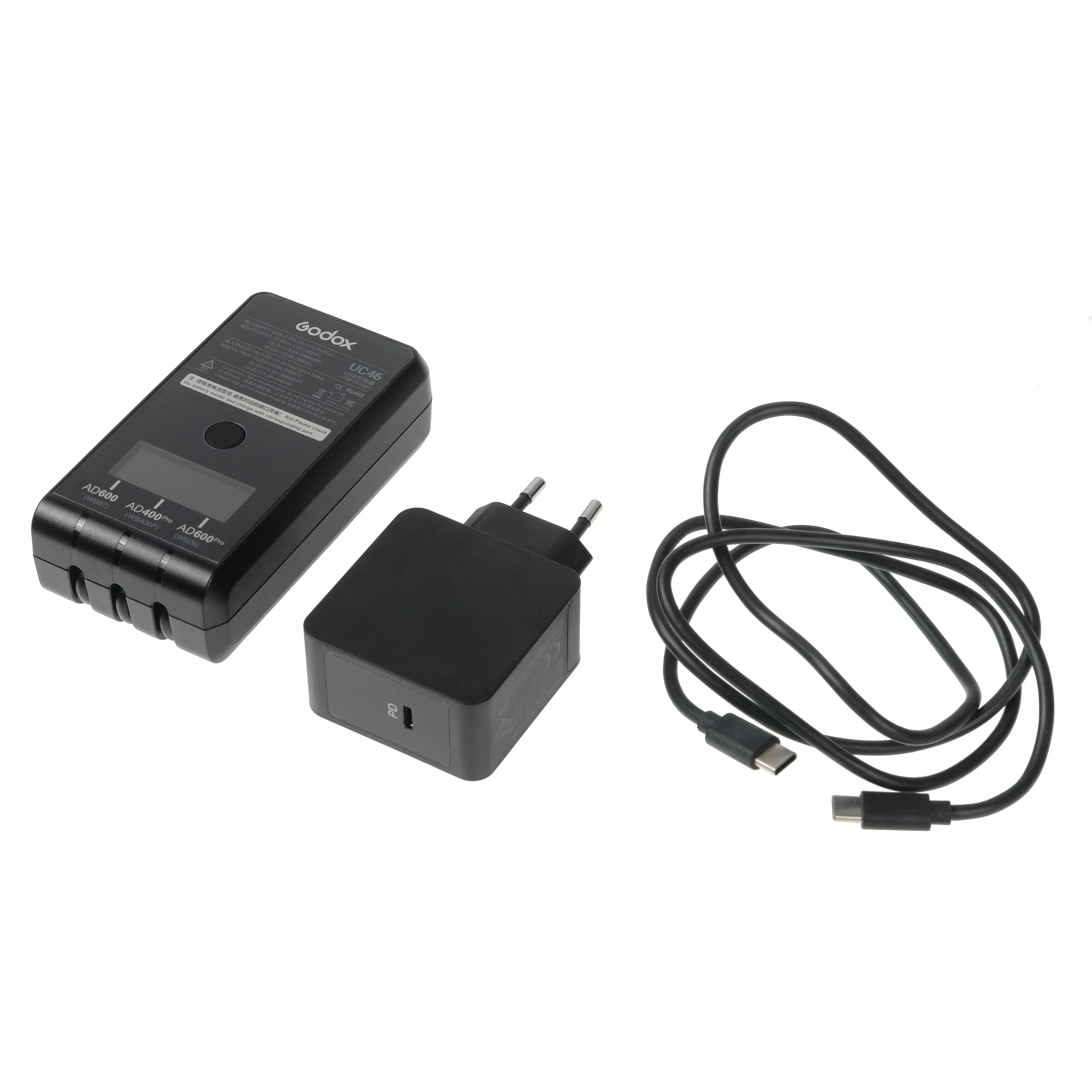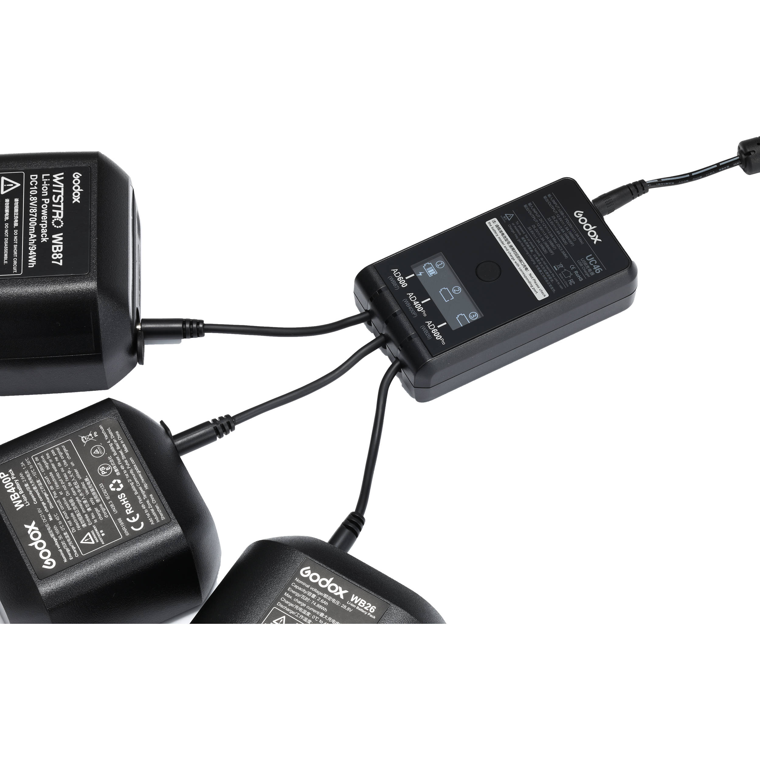 Godox UC46 представляет собой зарядное устройство Type-C и DC, предназначенное для зарядки аккумуляторов Godox WB400P, WB87 и WB26. Это портативное зарядное устройство может заряжать по очереди (последовательно) все три типа батарей для вспышек Godox серии AD400Pro, AD600B / AD600BM, AD600Pro соответственно.