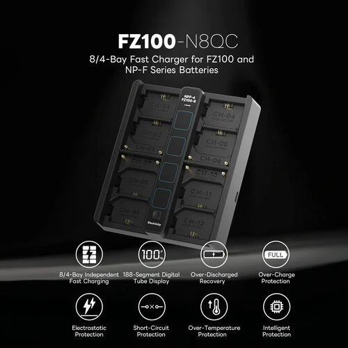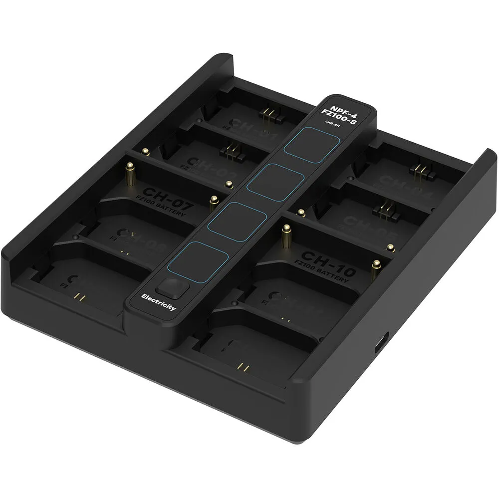 Устройство рассчитано на профессиональное применение: оно заряжает до 8 аккумуляторов NP-FZ100 или 4 аккумулятора NP-F970 и аналогов одновременно. Такая производительность особенно полезна на съёмках с большим объёмом работы или при подготовке оборудования для многодневных проектов.