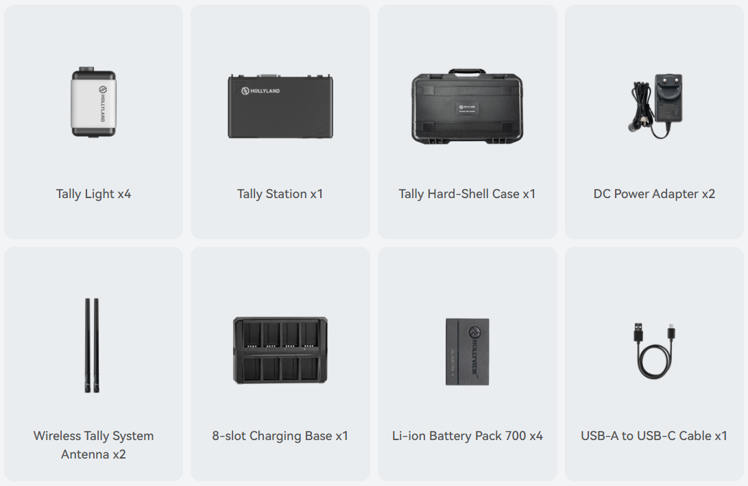 Hollyland Tally Light предназначен для использования с беспроводной системой. Он обладает трехуровневой регулировкой яркости, дальностью передачи до 2600 футов и задержкой передачи менее 150 мс. В комплект входит литий-ионный аккумуляторный блок и набор цифровых наклеек для легкой идентификации устройств при использовании нескольких tally lights.