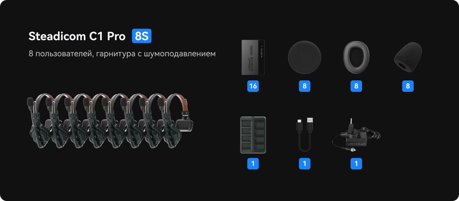 - Усиленная защита от помех: Две антенны на каждой гарнитуре, Steadicom C1 Pro обеспечивает непревзойденную стабильность и четкость связи без помех с удвоенной емкостью пользователей на канале связи.