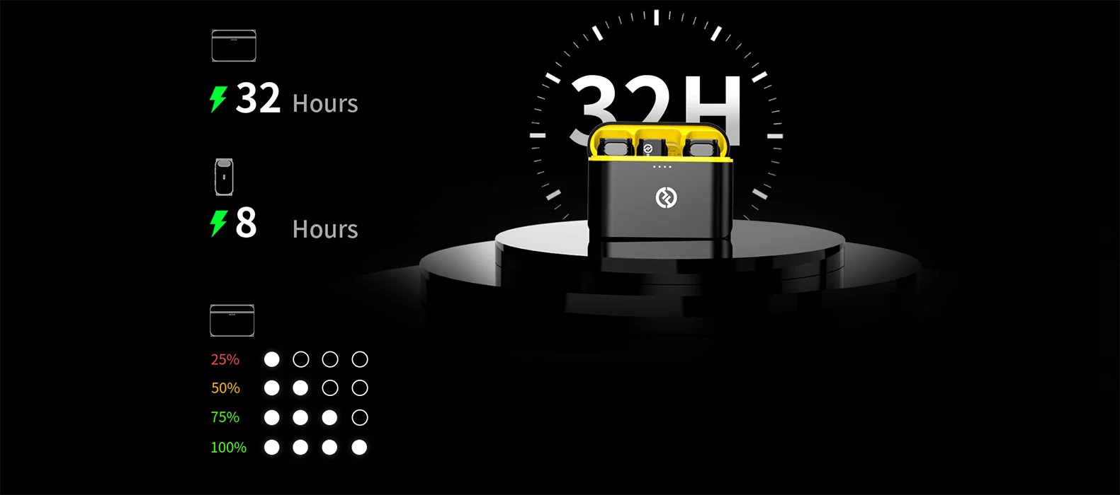 - До 32 часов работы – встроенный аккумулятор передатчика обеспечивает 8 часов автономной работы, а при помощи зарядного кейса общее время работы достигает 32 часов, достаточно для полного дня съемок.