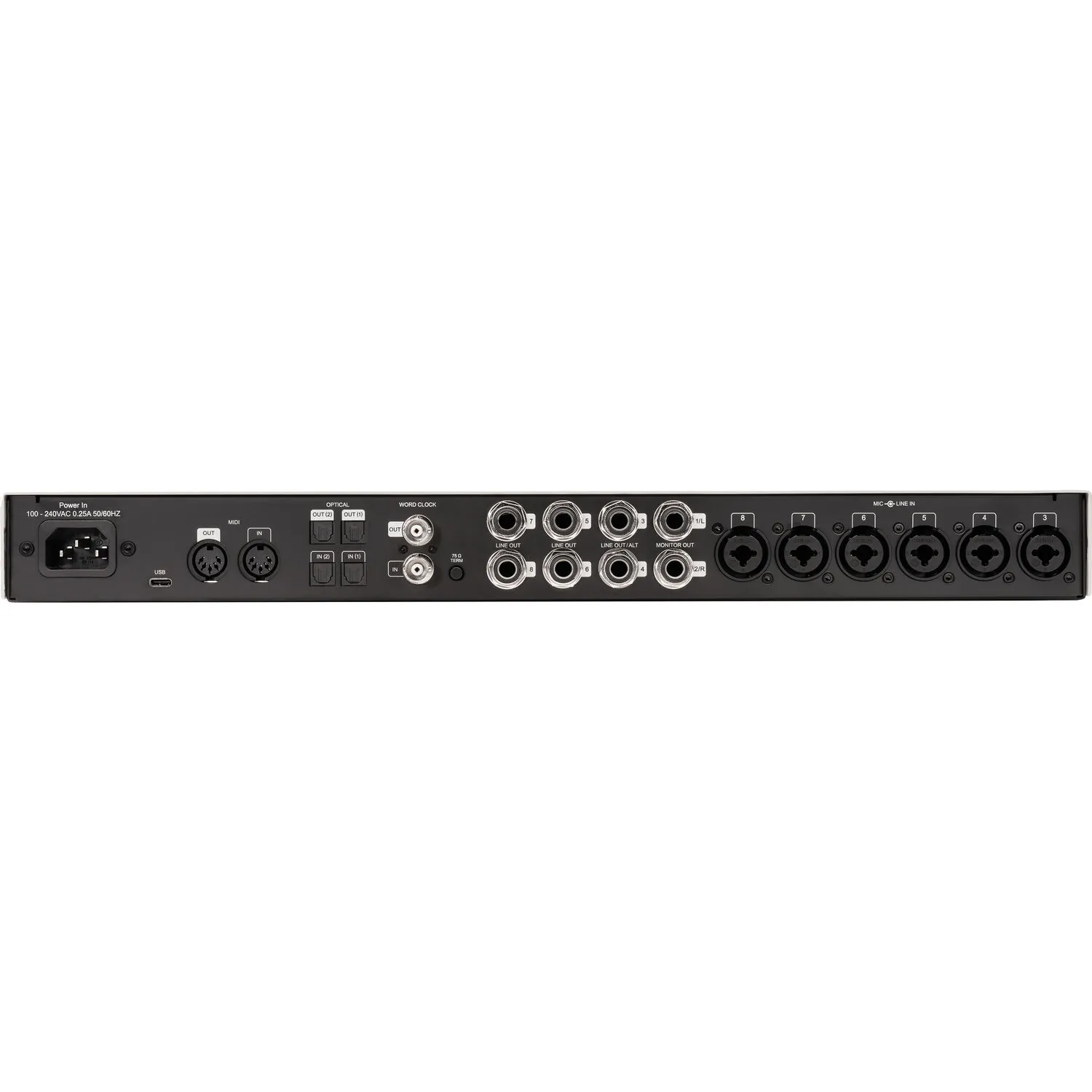 Интерфейс предлагает обширную коммутацию: шесть XLR-TRS входов на задней панели, два на передней, три пары линейных выходов (каналы 3–8), основные мониторные выходы, два раздельных наушниковых выхода с индивидуальной громкостью, MIDI через 5-контактный DIN, BNC-вход/выход wordclock и оптический порт TOSLINK (ADAT/S/PDIF). Через ADAT можно объединить до трёх Volt 876 для системы записи на 24 канала.