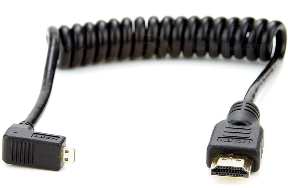Спиральные кабели Atomos обеспечивают аккуратный вид рабочей зоны и снижают риск спутывания проводов во время активной съёмки. Эта модель соединяет устройства через интерфейсы Micro-HDMI и полноразмерный HDMI, предлагая удобство использования в компактных системах записи. Основное преимущество заключается в способности сохранять порядок без ограничения мобильности оператора.