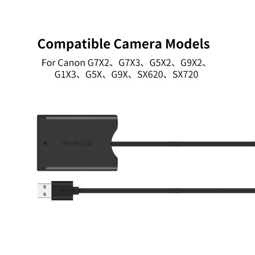 Этот адаптер предназначен для совместимости с широким спектром цифровых камер Canon, которые используют аккумуляторы типа NB-13L. Список совместимых моделей включает: Canon G7X2, G7X3, G5X2, G9X2, G1X3, G5X, G9X, SX620, SX720