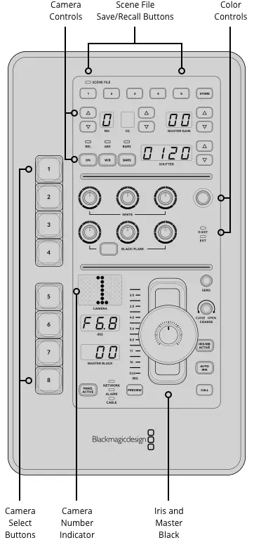На панели расположены восемь кнопок выбора камеры с индикацией состояния: зелёный — камера в эфире, красный — готова к эфиру. Система CCU-каналов для быстрого переключения между камерами. Центральная часть панели оснащена отдельными регуляторами для каналов RGB, позволяющими точно настраивать чёрные и белые уровни. Выравнивает цветопередачу между разными камерами, исключает цветовые скачки при переключении.