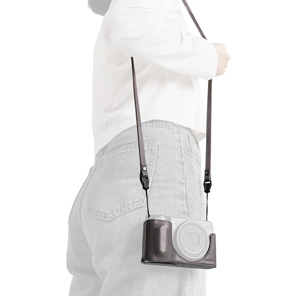 Ремень совместим с большинством компактных камер, имеющих стандартные отверстия для ремня (например, Ricoh GR, Sony ZV-1 II, Canon G7 X Mark III), а также с чехлами для смартфонов. Три цвета кожи позволяют подобрать аксессуар под свой стиль — от сдержанного до выразительного.