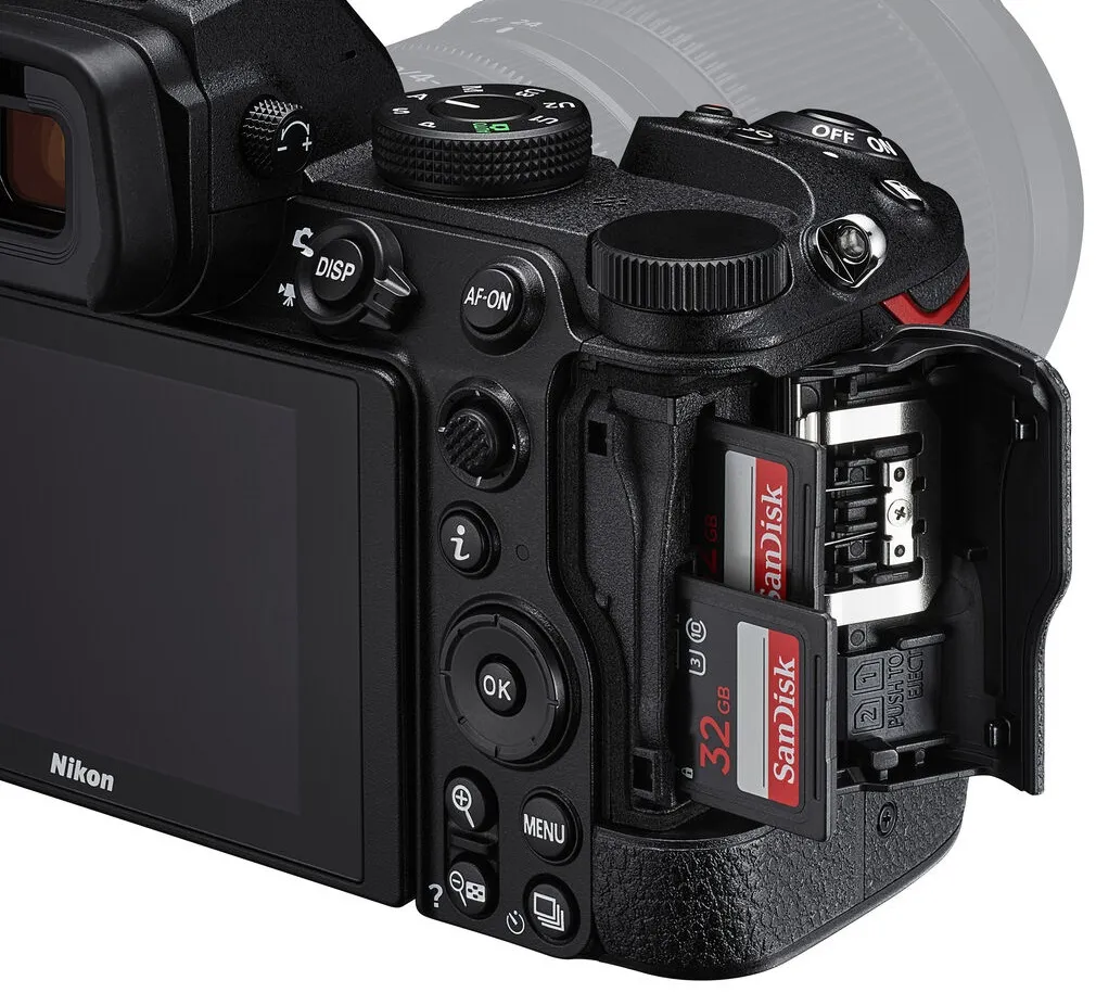 - Двойные гнезда для карт памяти поддерживают высокоскоростные карты UHS-II, обеспечивая удобство резервного копирования и распределения файлов.