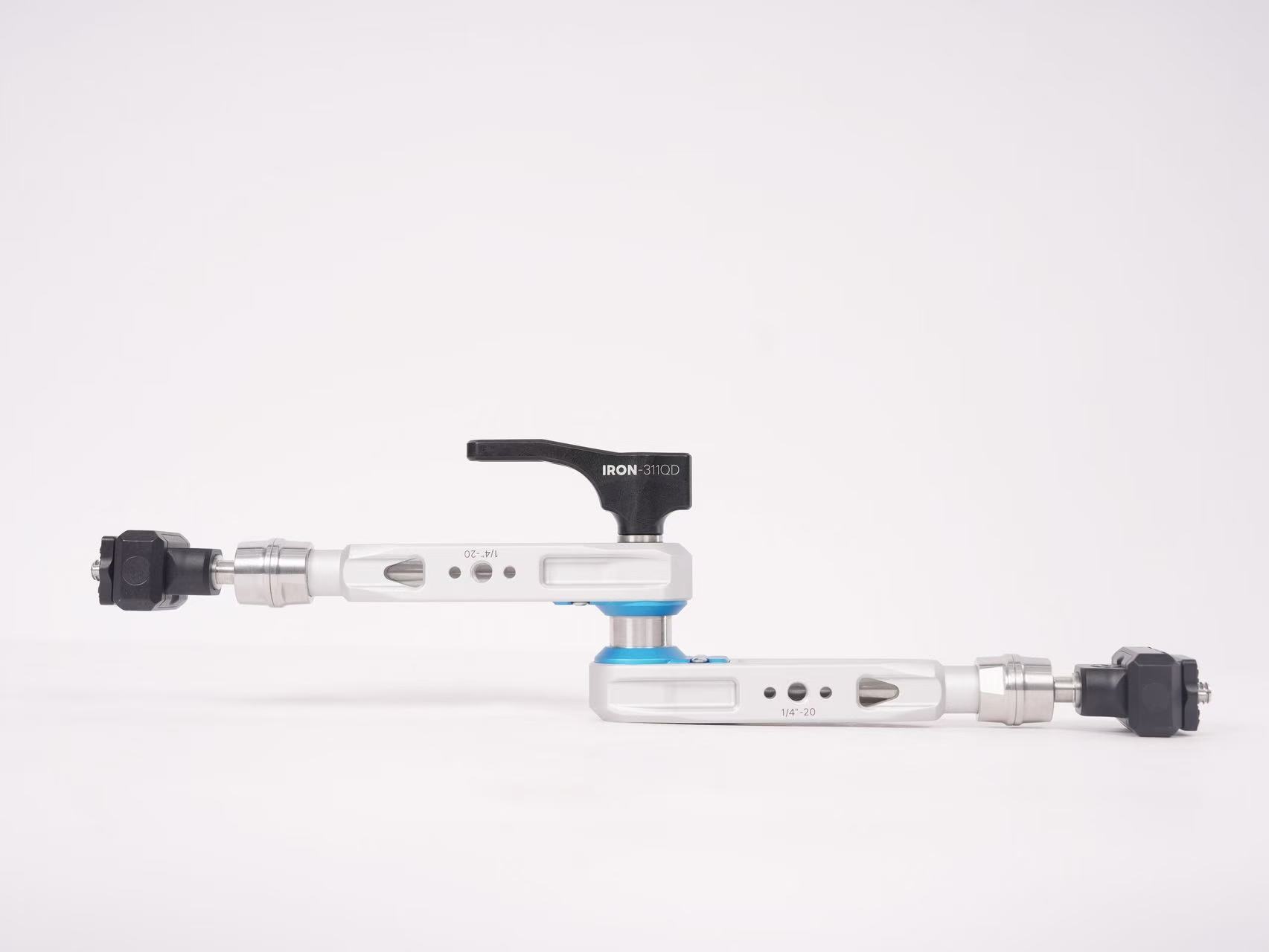 IRON-311QD это мэджик-арм инновационной демпфирующей конструкции от DigitalFoto. Он выдерживает вертикальную нагрузку в 5 кг и горизонтальную в 2.5 кг. Для крепления на концах ручек с антискользящим покрытием предусмотрены винты 1/4" с фиксирующими штифтами. Также в ручках есть отверстия 1/4" и 3/8" для дополнительного увеличения конструкции или установки аксессуаров при необходимости.