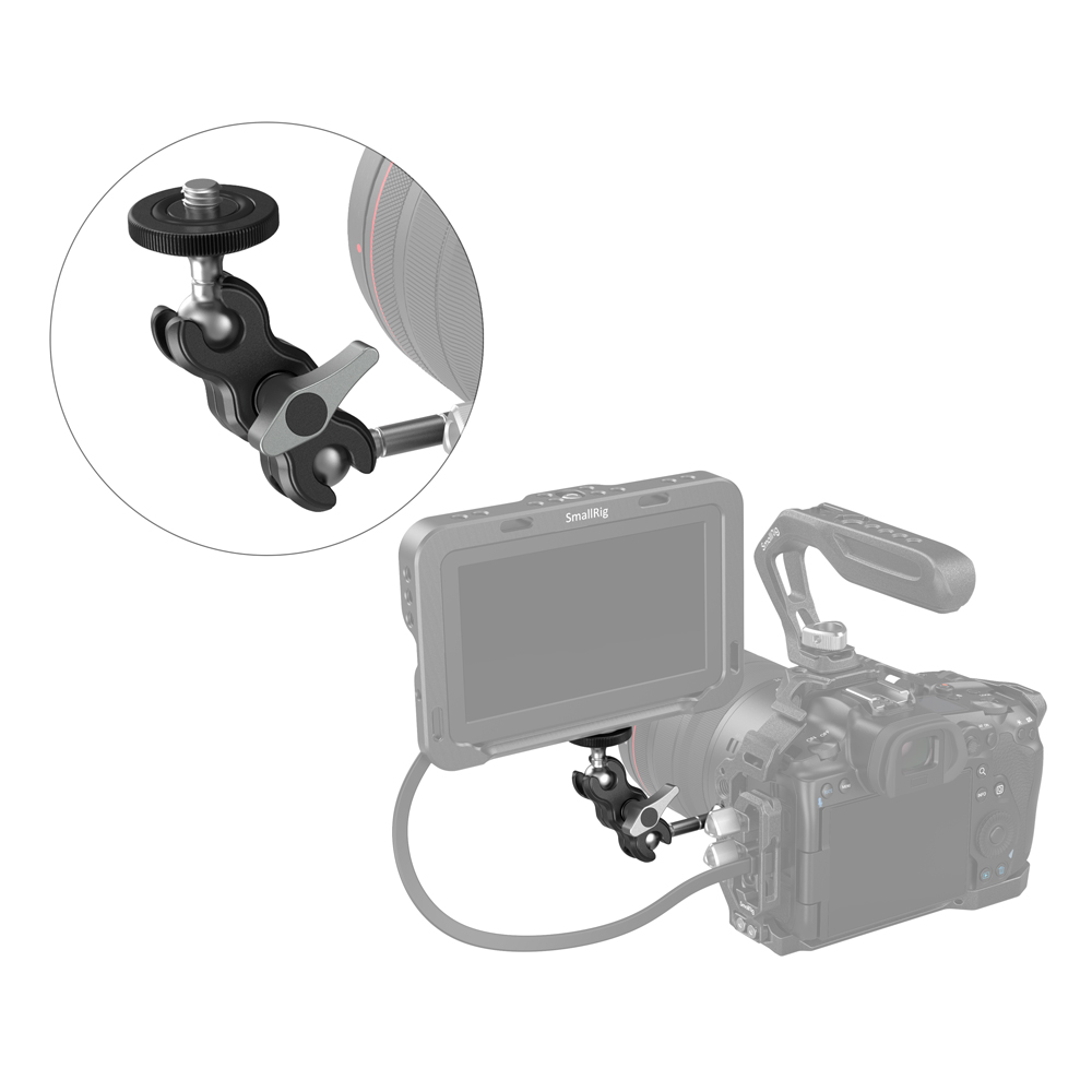 Шарнирный держатель с универсальной головкой SmallRig 3238 состоит из двух шариковых головок с винтами 1/4 " и зажима с шаровой головкой. Его можно прикрепить к верхней или боковой части клетки с одной стороны, а с другой - к монитору. Встроенные подушки предотвращают царапины. Он гибкий и удобный для регулировки подходящего угла. Компактный и занимающий мало места, Magic arm подходит для съемки с использованием легкого оборудования.