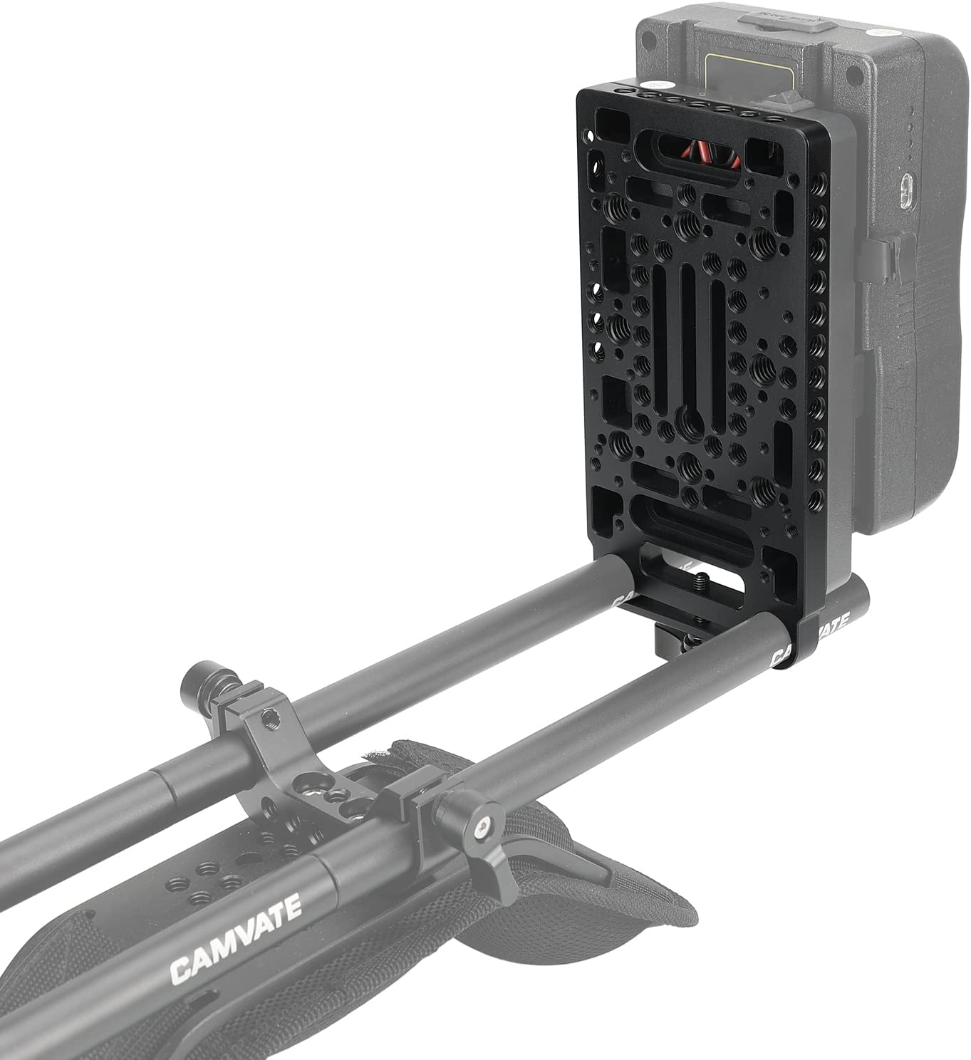 Эта задняя панель с 15-миллиметровым рейлблоком от CAMVATE и с расширенными точками крепления позволяет встраивать аккумуляторную панель в любую конфигурацию установки. Задняя панель крепится к батарейной плате с помощью прилагаемых винтов 1/4 " -20 и 3/8"-16. Дополнительные винты 1/4 "-20 помогают прикрепить их к корпусу камеры. 15-миллиметровый двухштоковый зажим LWS также позволяет прикрепить cheese plate к плечевым креплениям, установленным на штанге.