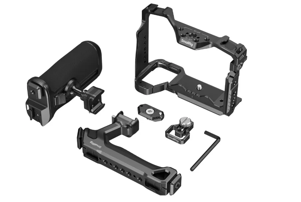Откидная крышка отсека аккумулятора одновременно служит упором для мизинца — это улучшает хват при длительной съёмке. В комплекте идёт зажим для HDMI-кабеля, который предотвращает его случайное выдергивание и снижает нагрузку на разъём камеры. Для сборки и регулировки в основании клетки спрятан магнитный шестигранник, он всегда под рукой.