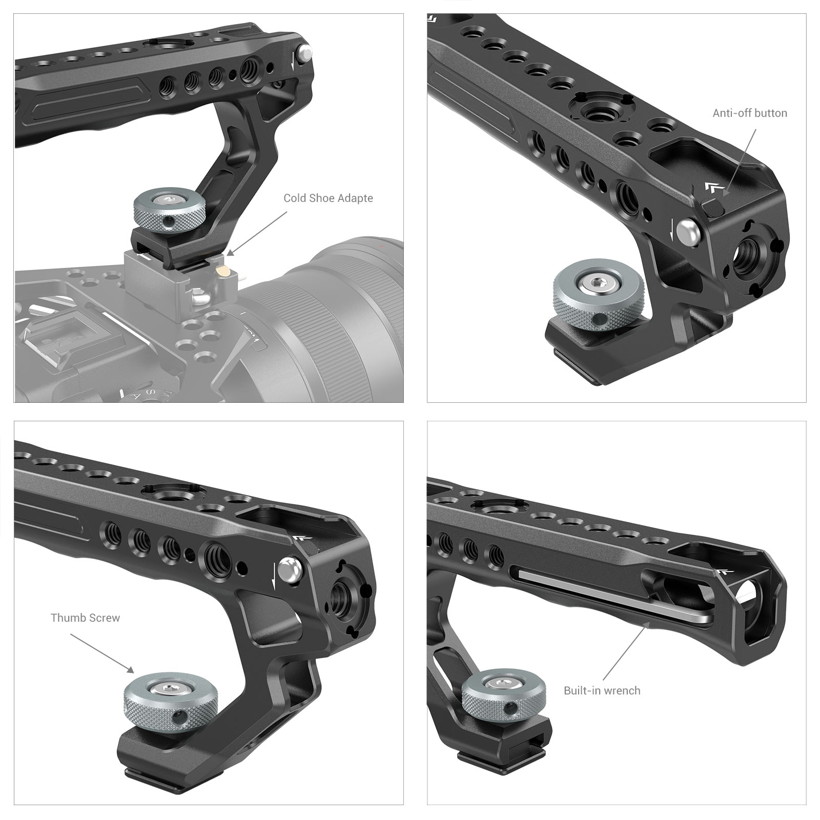 Верхняя ручка с креплением Cold Shoe SmallRig 2094C помогает надежно удерживать камеру при съемке с рук особенно в движении. Крепления холодного башмака на передней части обеспечивают быструю сборку и демонтаж и предотвращают случайное отсоединение В целом, легкая и практичная рукоятка может обеспечить широкий выбор точек крепления и отличный опыт съемки.
