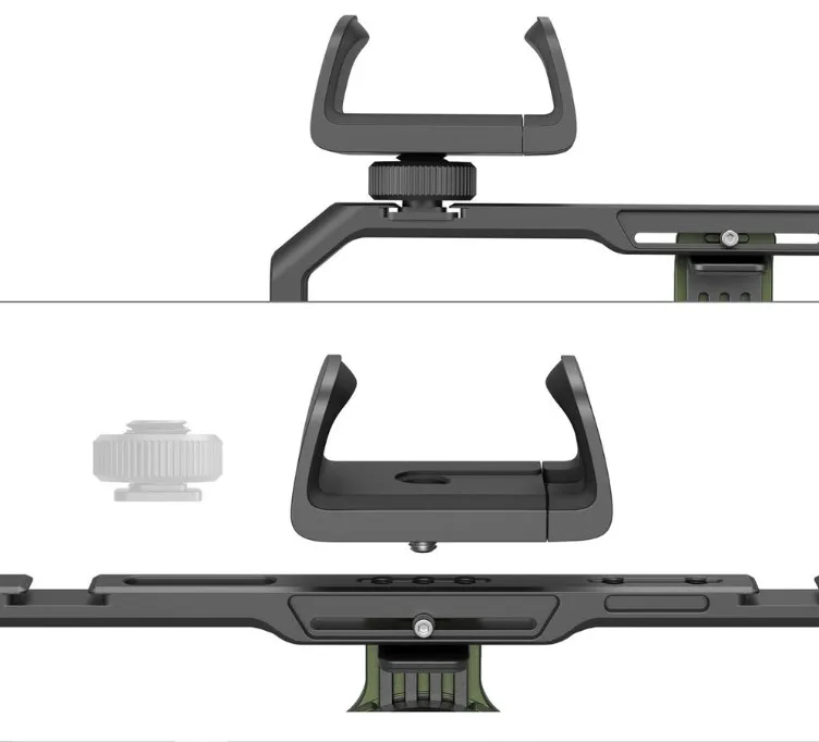 Рукоятки вращаются без ступеней и легко переходят из бокового в верхнее положение идеально для смены стиля съёмки «на лету». Благодаря быстросъёмным механизмам с обеих сторон комплект собирается и разбирается без инструментов. Для установки на штатив предусмотрен адаптер Arca-Swiss, совместимый со стандартными головами.