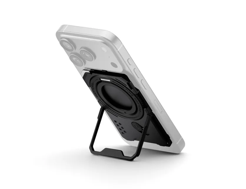 Интегрированная регулируемая подставка позволяет устанавливать телефон под нужным углом как в горизонтальной, так и в вертикальной ориентации — идеально для съёмки влогов, видеозвонков или мониторинга. В комплект входит съёмное магнитное кольцо, совместимое с широким спектром аксессуаров от мини-осветителей до кольцевых хватов. Кольцо поворачивается, что даёт дополнительную свободу при настройке ракурсов и компоновки.