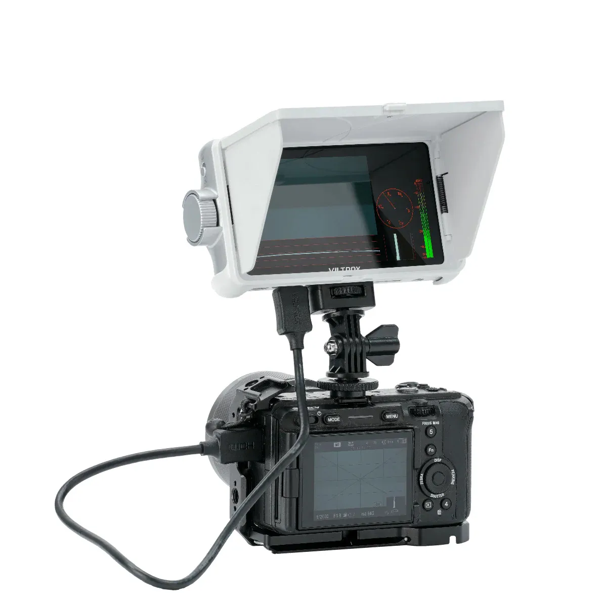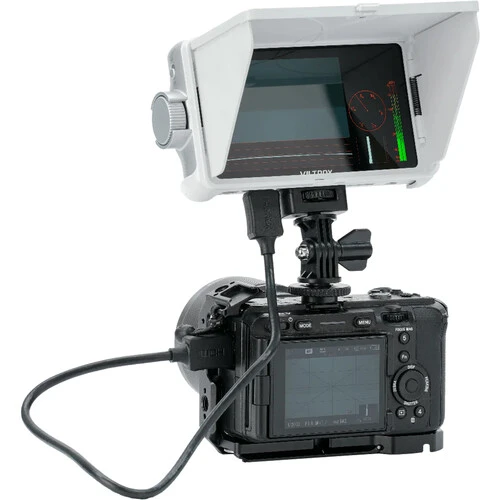 Viltrox DC-V1 включает в себя ряд функций, необходимых при съёмке: гистограмма, волновая форма, контроль аудиосигнала через встроенный динамик или разъём 3,5 мм. Через слот для SD-карты можно не только обновлять прошивку, но и загружать собственные 3D LUT-файлы для предпросмотра цветокоррекции в реальном времени.