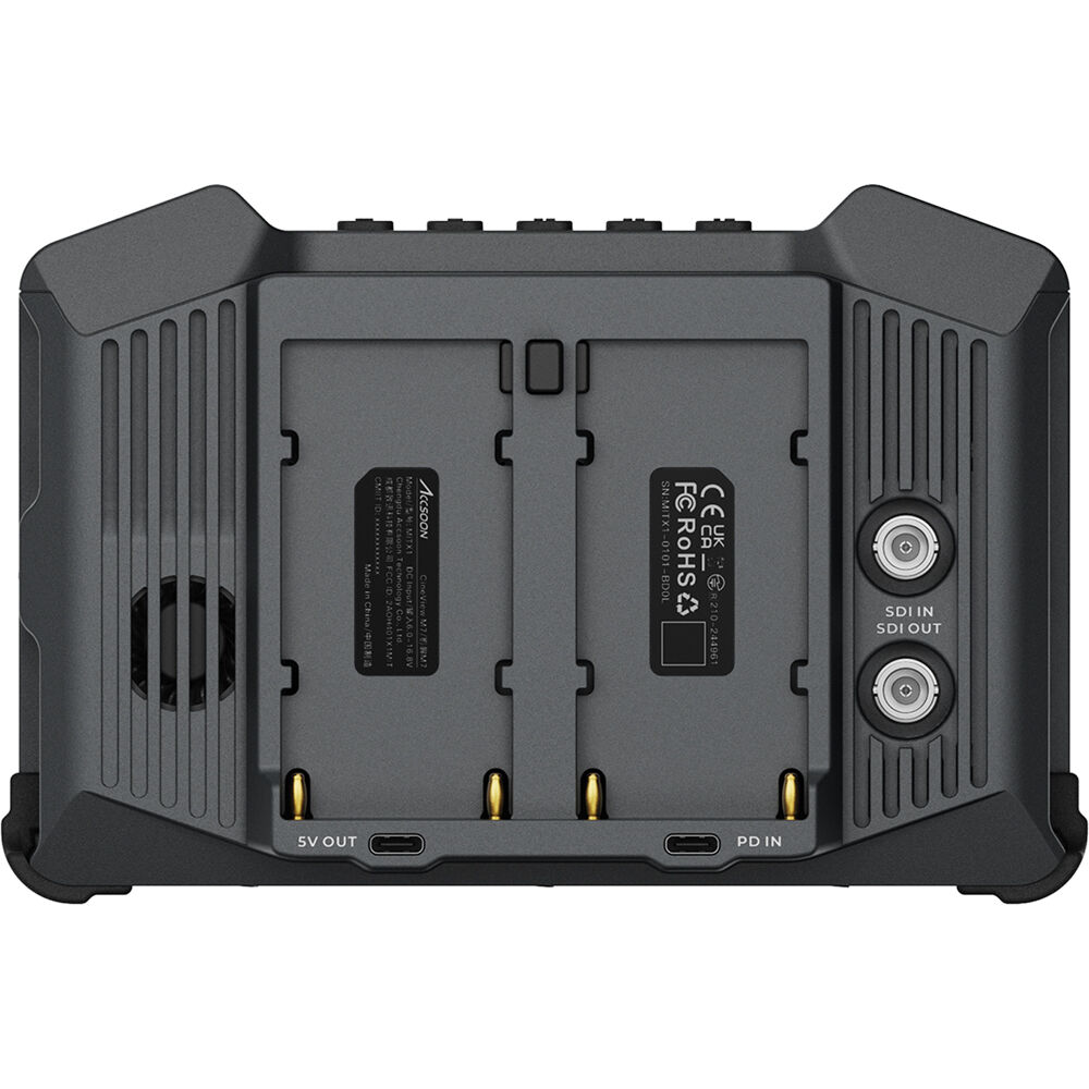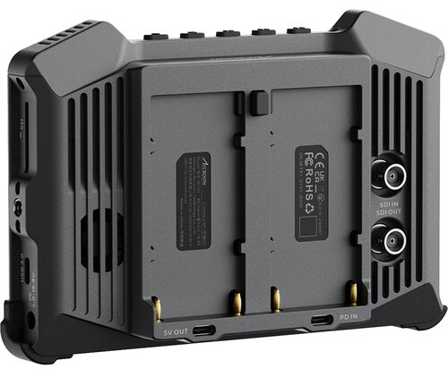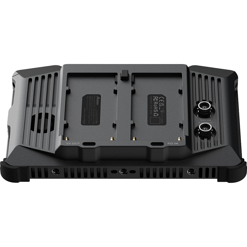 Питание осуществляется через два слота для аккумуляторов L-series / NP-F сзади, через DC-вход 2,1 мм (16,8 В) или через USB-C PD с внешним блоком питания 9 В, 3 А (продаётся отдельно). Также монитор может передавать питание на камеру или внешнее устройство через выход USB-C 5 В.