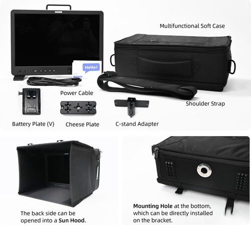 - Удобство использования: В комплекте поставляется солнцезащитный козырек, адаптер для C-образной стойки, мягкий чехол и питающий кабель.