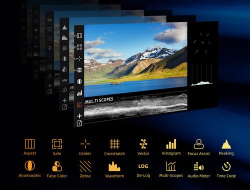 - Дополнительные инструменты: DeLog, многоэкранное отображение (Multi-scope), поворот дисплея, уровень звука (через SDI), времякод (через SDI).