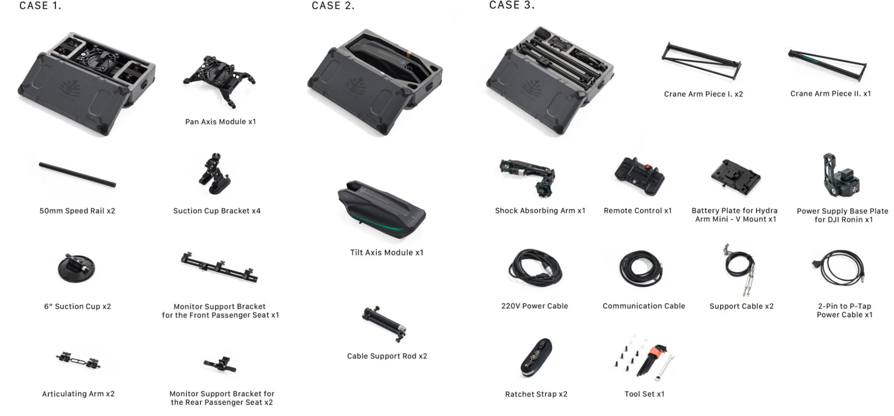 Лёгкая конструкция без противовесов обеспечивает быструю установку и безопасность в эксплуатации — оператору достаточно сосредоточиться на управлении одним концом стрелы. набор включает присоски, скоростные штанги и ремни с храповым механизмом, позволяющие легко закрепить систему на большинстве автомобилей, способных выдержать вес 80 кг (без учёта камеры и стабилизатора). Амортизирующая рука поддерживает стабилизатор при работе на неровных поверхностях и регулируется под различные нагрузки. Амортизирующая головка позволяет независимо настраивать горизонтальную и вертикальную оси.
