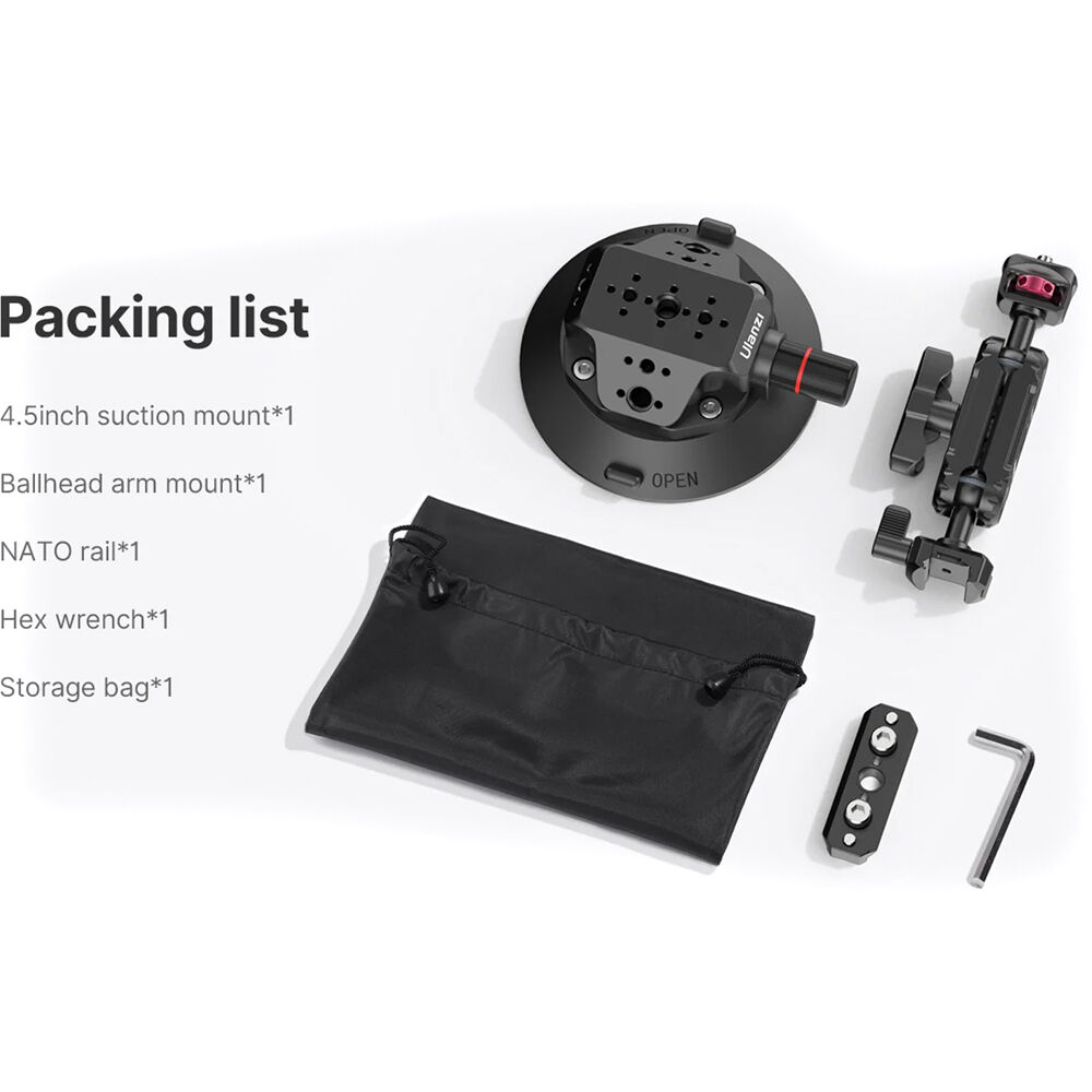 Сверхпрочное крепление на присоске SC-02 от Ulanzi крепится к плоским поверхностям, таким как движущийся транспорт, с помощью прочного присосного устройства диаметром 4,5 дюйма, регулируемого мэджик арма, направляющей NATO и сумки для хранения.
