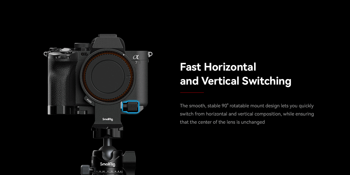 Поворотная площадка SmallRig 4148 - это инновационная горизонтально-вертикальная площадка, разработанная специально для камер Sony Alpha 7R V, Alpha 7R IV, Alpha 7 IV и Alpha 7S III. Она предназначена для быстрого переключения между горизонтальным и вертикальным режимами без необходимости коррекции оптической оси объектива.