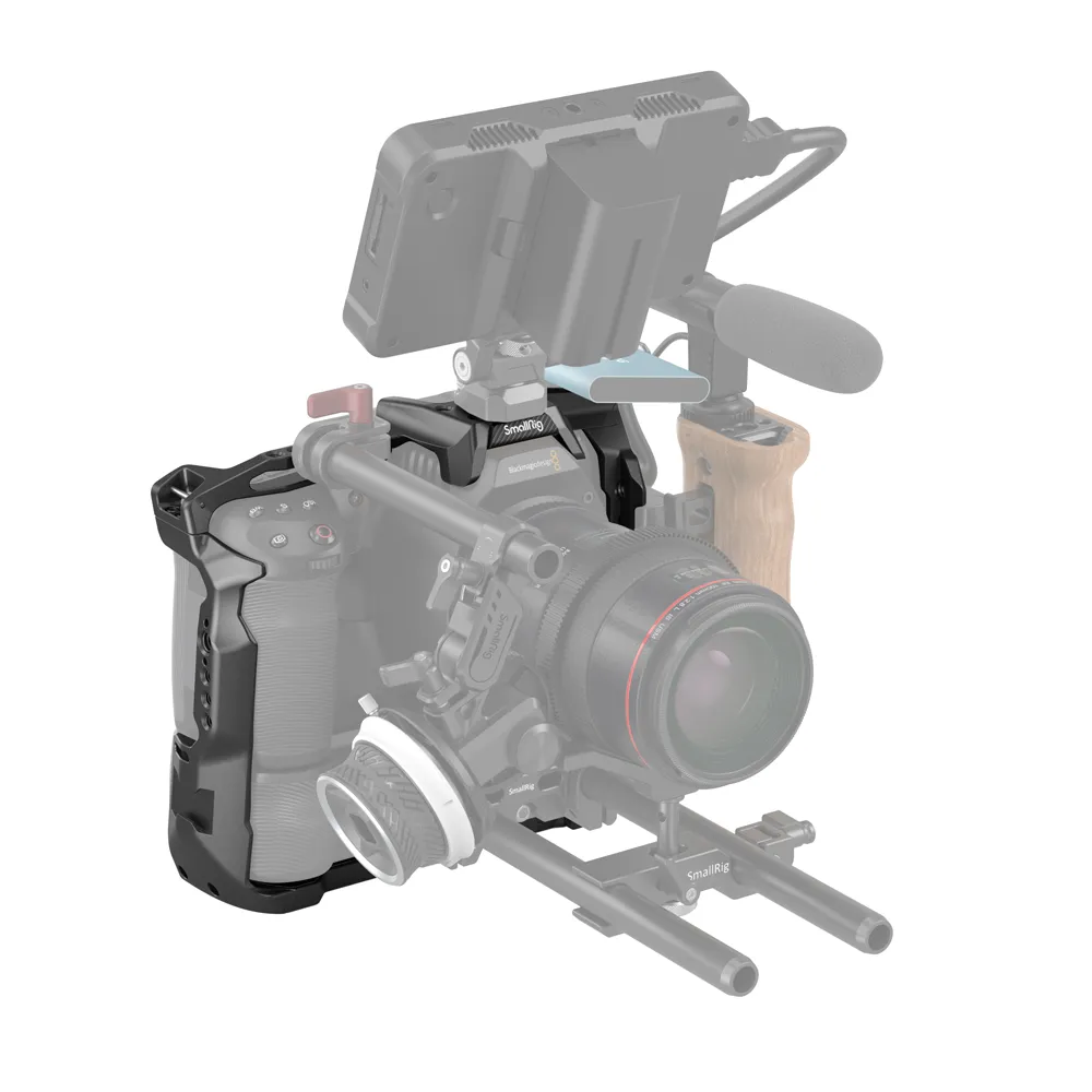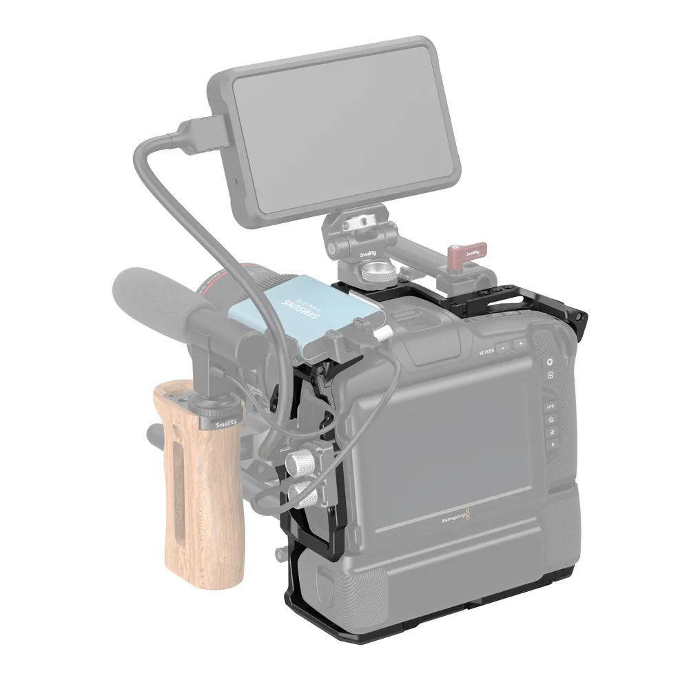 Клетка с батарейным отсеком SmallRig 3382B для камеры BMPCC 6K Pro / 6K G2 оснащена отверстием ARRI 3/8" -16 для крепления верхней ручки ARRI 2165 и "холодным башмаком" для Samsung T5 SSD-накопителя 3272. Клетка поставляется с отверстиями для плечевого ремня в верхней части каждой стороны для крепления плечевого ремня или других аксессуаров. На левой стороне имеется направляющая НАТО, отверстия с резьбой 1/4 "-20 для крепления боковой ручки HSN2270 и специальный зажим для кабелей HDMI и USB-C 3271. Отверстия в правом верхнем и левом нижнем углу обеспечивают доступ к зажиму для фиксации стержня фокусировки 3276. Его нижняя часть совместима с двойным стержневым зажимом 1943, обеспечивающим расстояние между двумя стержнями и центром объектива 85 мм и обеспечивающим поддержку объектива при установке.