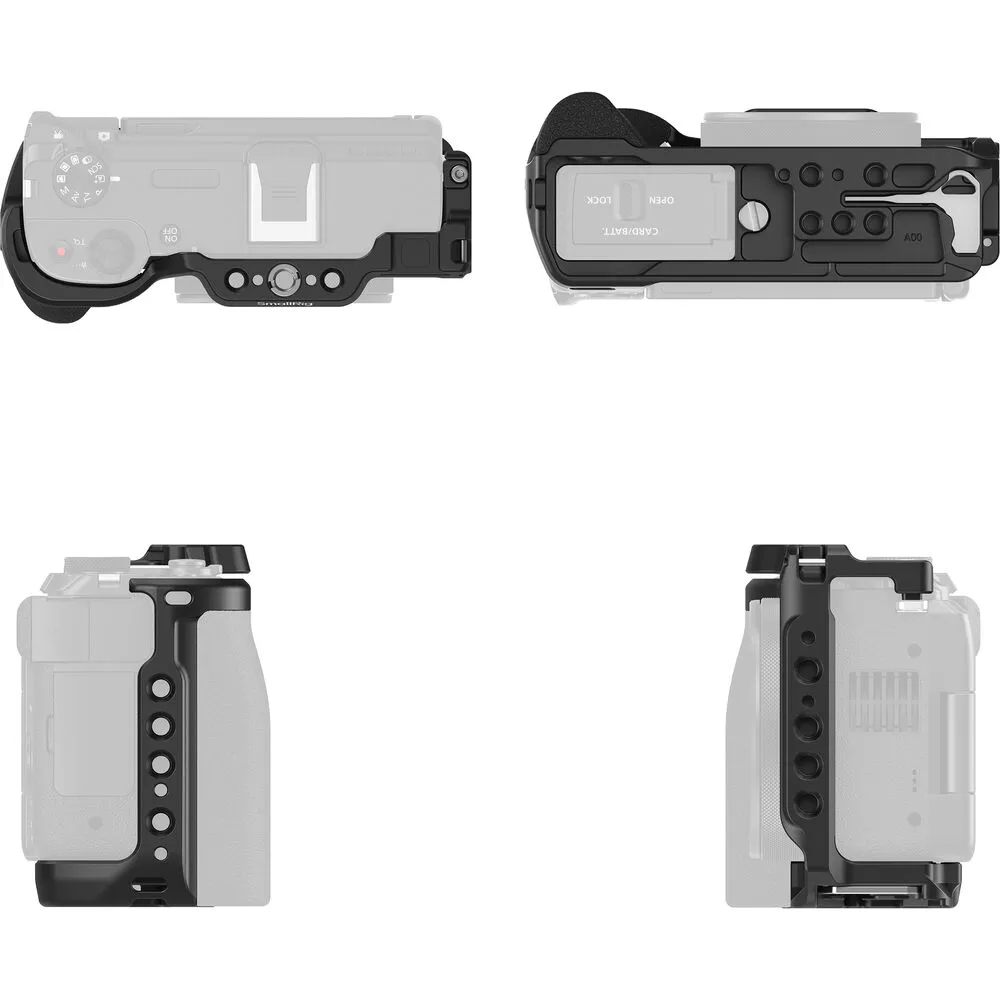 Клетка крепится к камере по двухточечной системе с использованием нижних и боковых фиксирующих блоков, что предотвращает смещение и обеспечивает стабильность. Встроенные силиконовые накладки защищают корпус от царапин. Эргономичная силиконовая рукоятка повышает комфорт и устойчивость хвата, а её текстура и цвет гармонично сочетаются с дизайном камеры, создавая единый эстетичный вид.