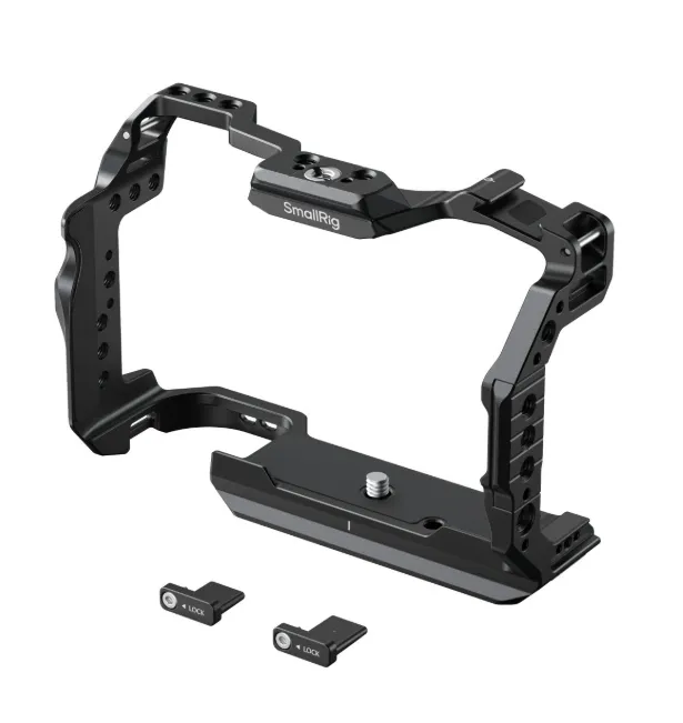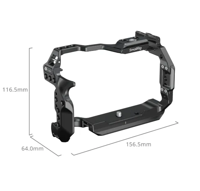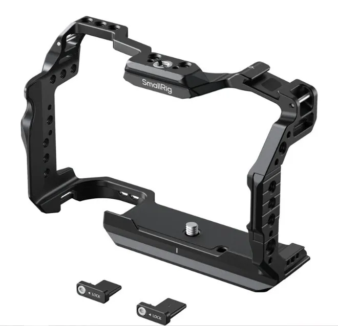 Клетка оснащена стандартными резьбами 1/4"-20 и другими точками крепления. Она включает базовую площадку Arca-Swiss для совместимости со штативами и стабилизаторами DJI RS серии.