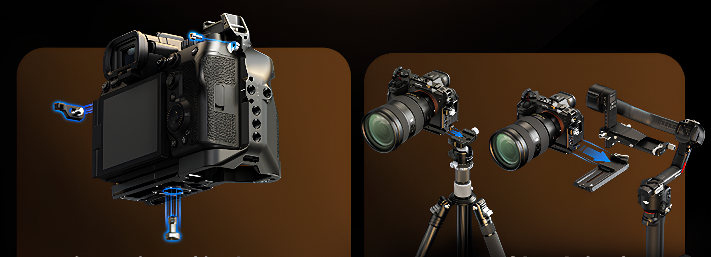 Поверхность клетки оснащена множеством профессиональных интерфейсов: стандартные резьбы 1/4"-20, отверстия 3/8"-16, холодный башмак и направляющая NATO. Интегрированная быстросъёмная площадка Arca-Swiss обеспечивает мгновенную установку на большинство штативов и совместима с популярными стабилизаторами, такими как DJI RS 3 или RS 4 Pro.
