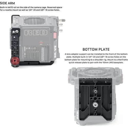 Tilta Advanced Kit ESR-T08-B-V — это универсальная и функциональная клетка, специально разработанная для камеры RED V-RAPTOR. Конструкция обеспечивает расширенные возможности для крепления аксессуаров, благодаря множеству монтажных отверстий 1/4", 3/8", ARRI Rosette и креплению на холодный башмак. Базовая площадка оснащена зажимами для 15-мм направляющих, что позволяет использовать компедий, системы поддержки объектива или привод фокуса. Модульный дизайн клетки обеспечивает надежную защиту камеры и удобство работы с ней.