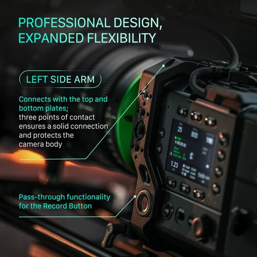 Верхняя пластина включает систему кабельных зажимов и крепление под монитор, а также дополнительную планку NATO для установки ручек или кольцевого хвата. На левой стороне реализована функция «пропуск сигнала» — через специально выведенную кнопку можно запускать запись, не дотягиваясь до корпуса камеры. Это особенно удобно при работе с ригом в плечевом режиме или на вытянутых руках.