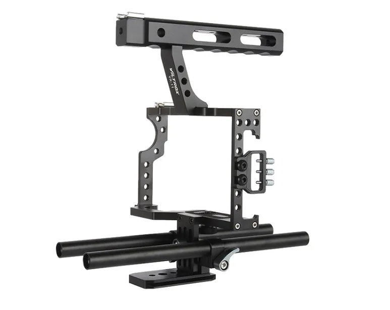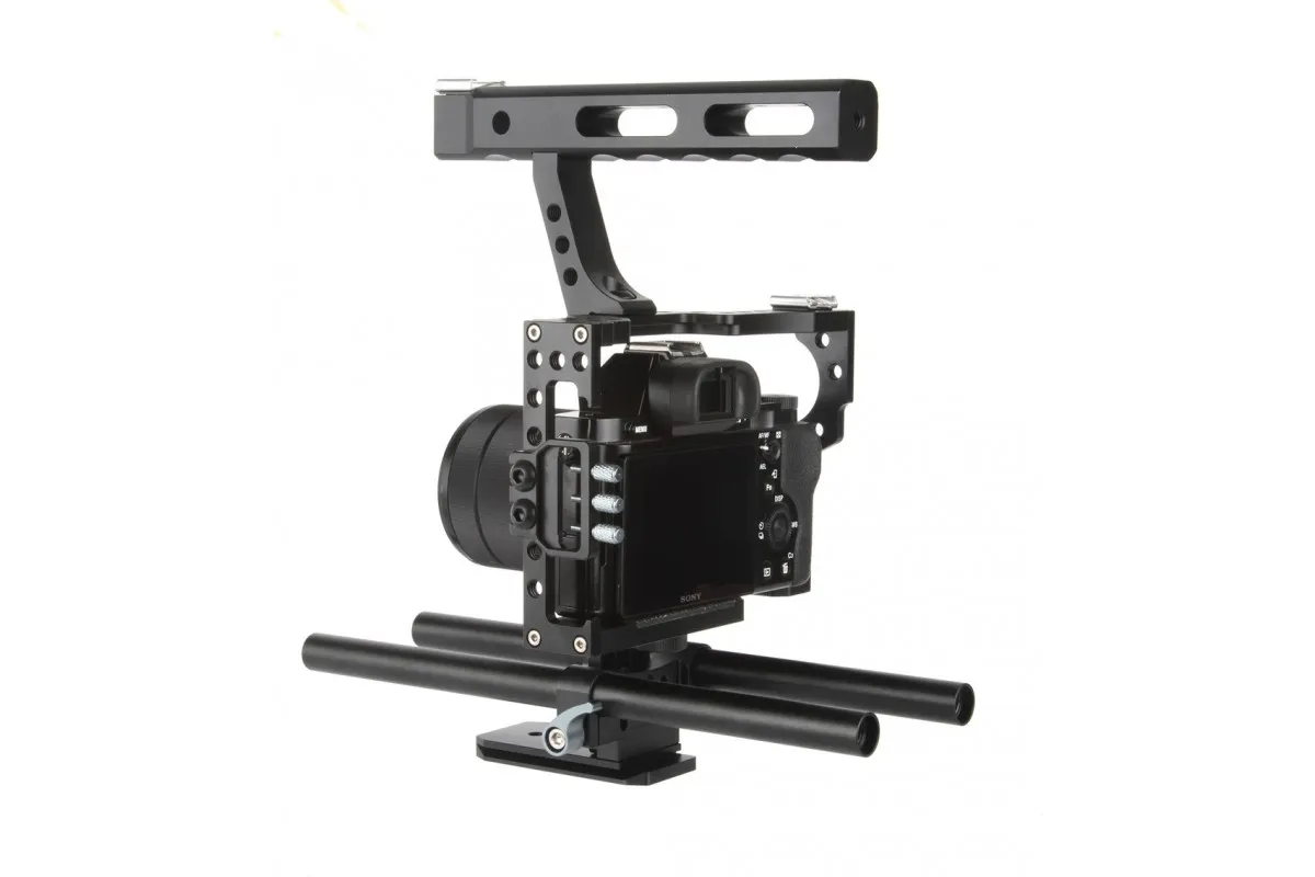 Клетка не привязана к одной модели камеры — она служит универсальной базой, к которой можно крепить различные адаптеры, базовые площадки или кронштейны. Нижняя часть совместима со штативами и головами через стандарт Arca-Swiss, а боковые и верхние узлы позволяют устанавливать кольцевой хват, ручки, мэджик армы или микрофоны без люфтов и перекосов.
