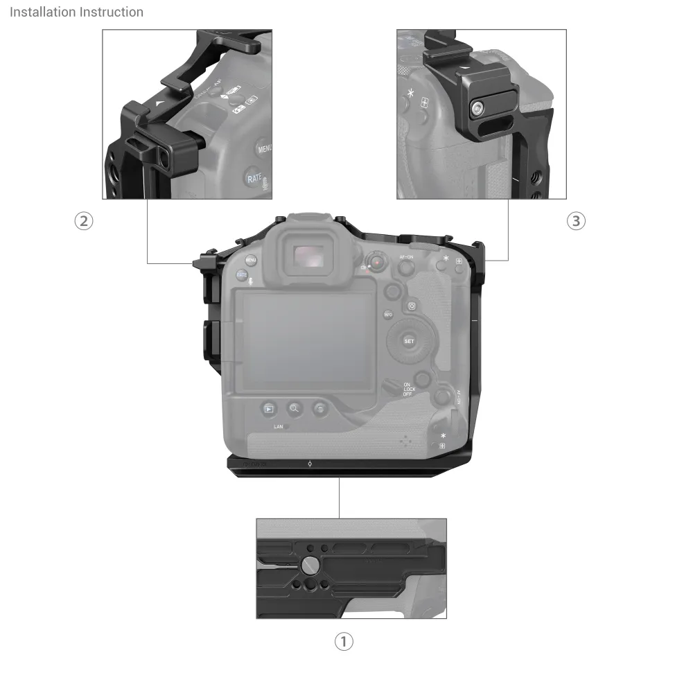 - Фиксация камеры: Для начала убедитесь, что ваша камера Canon EOS R3 выключена. Затем используйте один винт 1/4''-20 снизу и два боковых адаптера с замками с боковых сторон для надежной фиксации камеры в клетке.