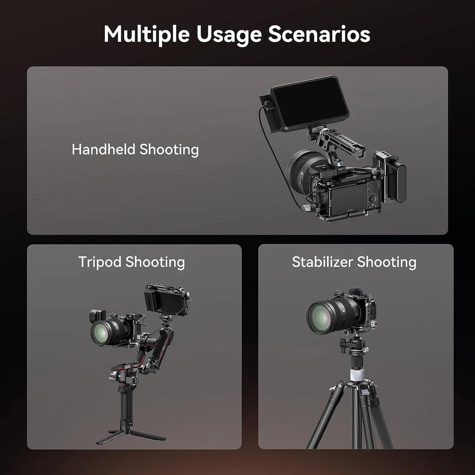 - Надежная конструкция: Изготовленный из алюминиевого сплава и нержавеющей стали, клетка обеспечивает устойчивость и долговечность, защищая вашу камеру от повреждений в условиях активной съемки.