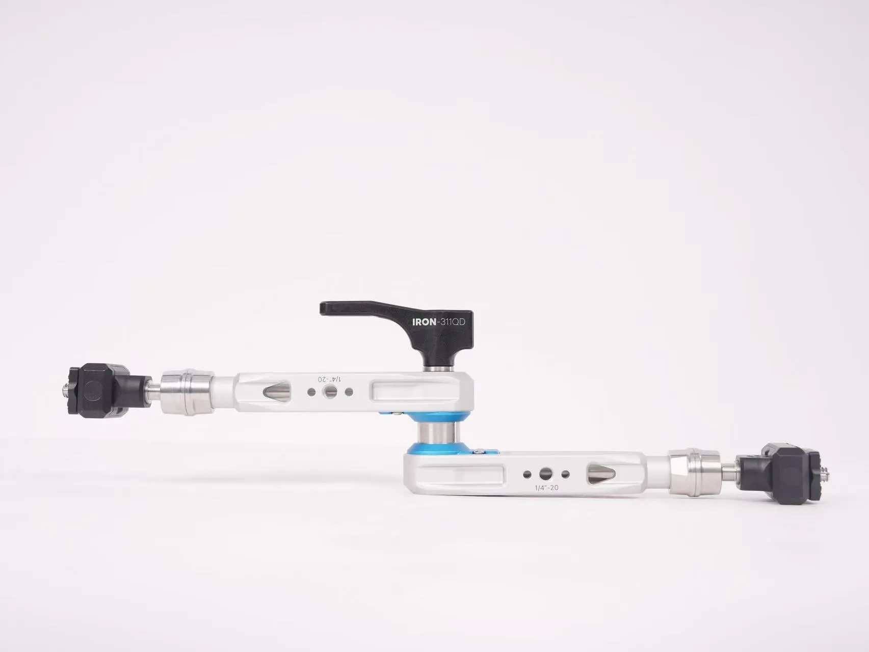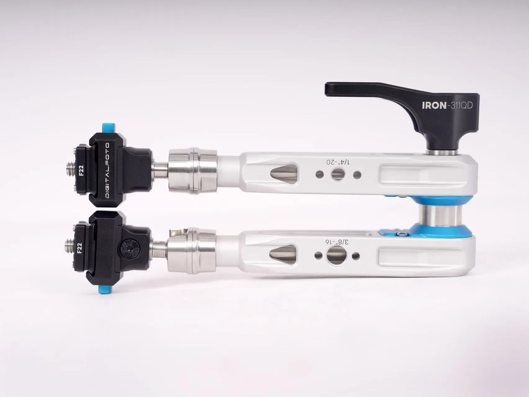 IRON-311QD это мэджик-арм инновационной демпфирующей конструкции от DigitalFoto. Он выдерживает вертикальную нагрузку в 5 кг и горизонтальную в 2.5 кг. Для крепления на концах ручек с антискользящим покрытием предусмотрены винты 1/4" с фиксирующими штифтами. Также в ручках есть отверстия 1/4" и 3/8" для дополнительного увеличения конструкции или установки аксессуаров при необходимости.