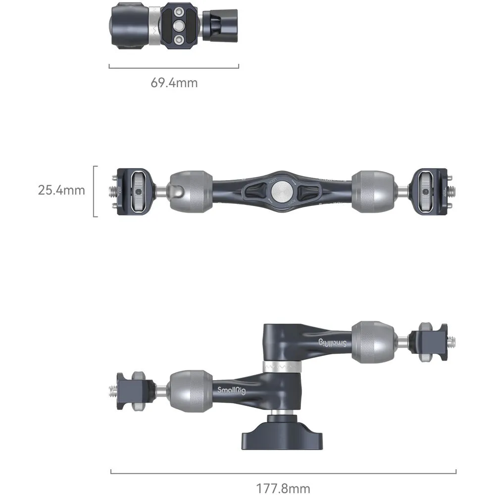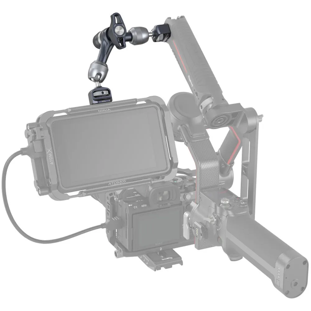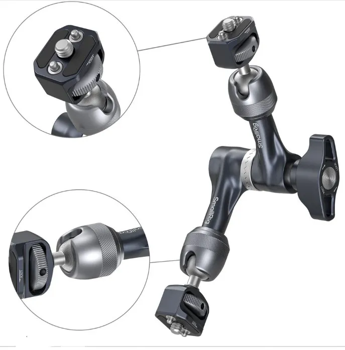 Установите монитор, свет или аксессуар на вашу камерную установку под практически любым углом с помощью 7-дюймового Magic Arm с розеточным соединением от SmallRig. Ручки из алюминия и нержавеющей стали оснащённы резьбами 1/4"-20 с обеих сторон. Обе шаровые головки и центральный шарнир фиксируются с помощью большого центрального рычага блокировки, а секции соединяются через поворотный розеточный шарнир с углом вращения 360°.