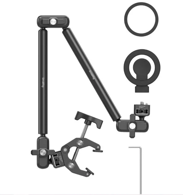 Двухсекционный мэджик арм позволяет точно настроить угол и высоту установки устройства. Все сочленения затягиваются вручную, дополнительные инструменты не требуются. Конструкция сохраняет положение даже при длительном использовании, что делает её удобной для стримов, видеозвонков или съёмки контента.
