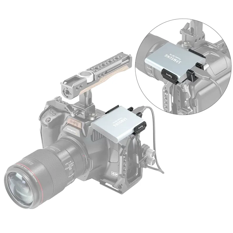 SmallRig 3272 это держатель для надежной фиксации SSD диска Samsung T5 или T7 на холодный башмак вашей камеры или клетки. Быстрое крепление и извлечение диска осуществляется с помощью удобного подпружиненного зажима.
