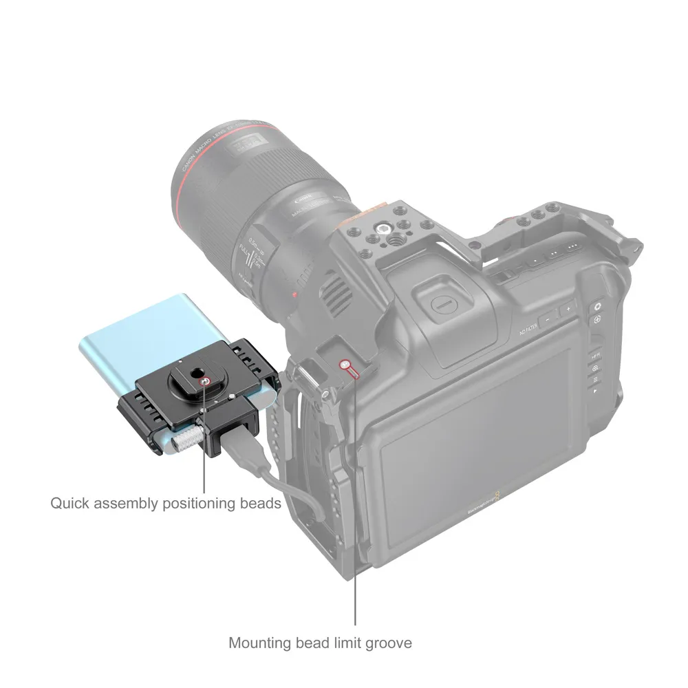 - Совместимость: Держатель идеально подойдет для работы с камерой BMPCC 6K. Крепление на холодный башмак позволяет расположить его в верхней левой части клетки, чтобы легко подключить диск к камере.