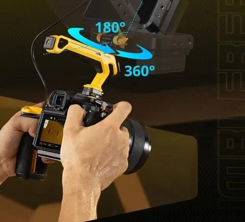 Кронштейн обеспечивает поворот на 360° и наклон до 180°, позволяя точно подобрать угол обзора в любых условиях съёмки. После настройки положение надёжно блокируется, исключая смещение даже при активном перемещении оператора.