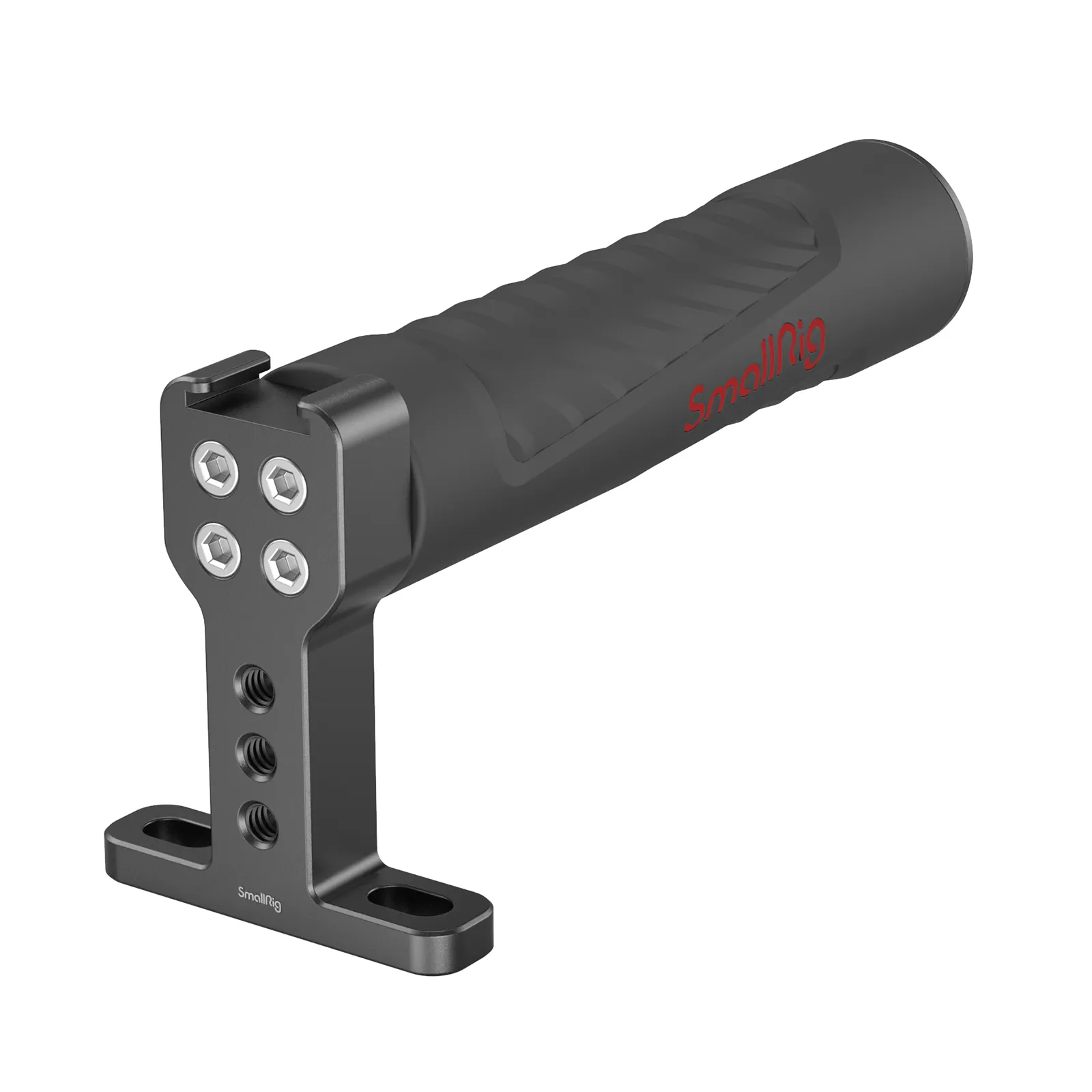 Ручка SmallRig 3323 фиксируется на клетках и другом оборудовании с помощью двух винтов ¼”. Высоту крепления рукоятки можно легко отрегулировать, для подбора оптимального положения. На верхней площадке рукоятки есть несколько отверстий с резьбой ¼” и разъем «холодный башмак» для установки дополнительных аксессуаров, например держатель монитора SmallRig 2904В или 2905В.