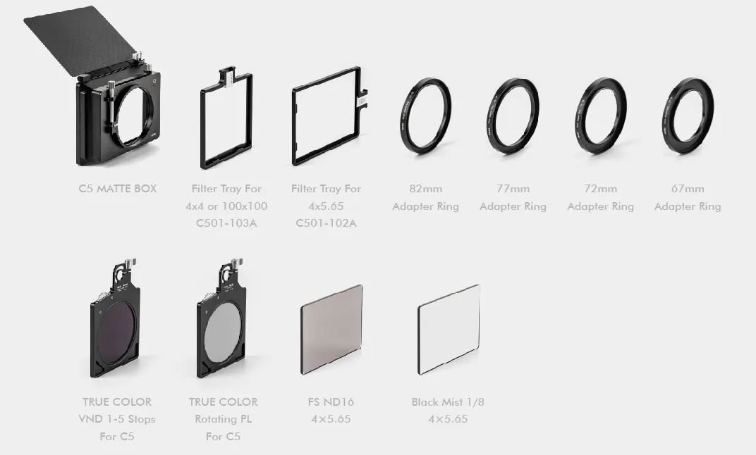 Компендиум NiSi C5 Cinema Kit — это легкий и удобный в использовании комплект для профессиональной киносъемки. Он поддерживает фильтры размером 4 x 4" и 4 x 5.6", что позволяет вам контролировать свет и получать четкие и яркие изображения. Изготовленный из пластика, алюминия и углеродного волокна, NiSi C5 отличается высокой прочностью и долговечностью. В комплекте предусмотрены адаптерные кольца для объективов с резьбой 67, 72, 77 и 82 мм, что делает его универсальным инструментом для различных задач.