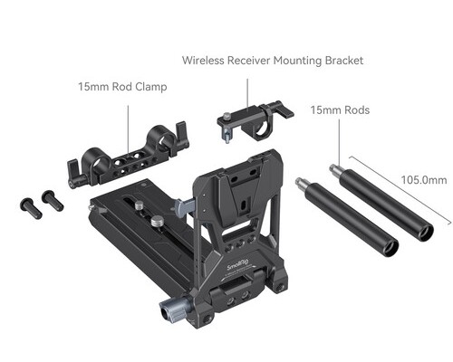 V-Lock пластина предназначена для крепления аккумуляторов формата V-Mount с выходами питания на задней части камеры, но не содержит электронных контактов — питание передаётся отдельным кабелем. Базовая площадка имеет регулируемый слайдер, позволяющий сдвигать камеру вперёд-назад на расстояние до 10 см для балансировки центра тяжести, особенно при использовании крупных объективов. В комплект также входит зажим с двумя 10 см алюминиевыми суппортами 15 мм, которые вкручиваются в заднюю часть площадки — это позволяет устанавливать дополнительные аксессуары, такие как подкладки, противовесы или ручки. Также предусмотрен крепёж, который фиксируется на штанге и имеет резьбу 1/4"-20 для передатчиков, приёмников или других мини-устройств.