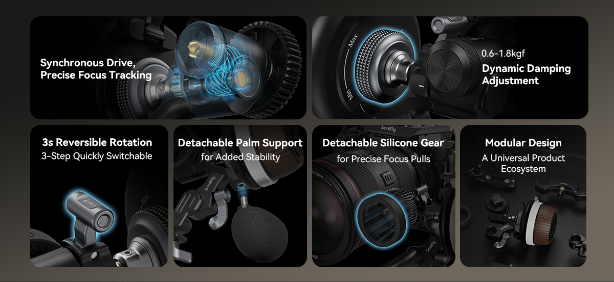 - Универсальная совместимость с линзами: Система подходит для большинства линз, включая кинематографические модели с зубчатым кольцом 0.8 MOD, а также силиконовые насадки M0.8-43T для плавной фокусировки.