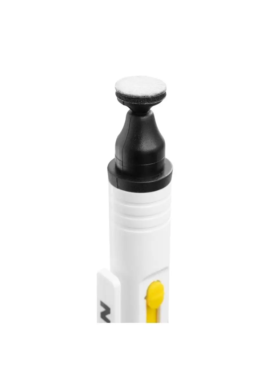 С одной стороны расположен втягивающийся щетинный кисть, которая аккуратно сметает крупные частицы пыли даже те, что не удаляются воздушной грушей. С другой — полировочный наконечник из специального состава, который не требует дополнительных средств и работает «на сухую». Такой подход исключает попадание абразивных частиц между стеклом и тканью, что снижает риск микроцарапин.
