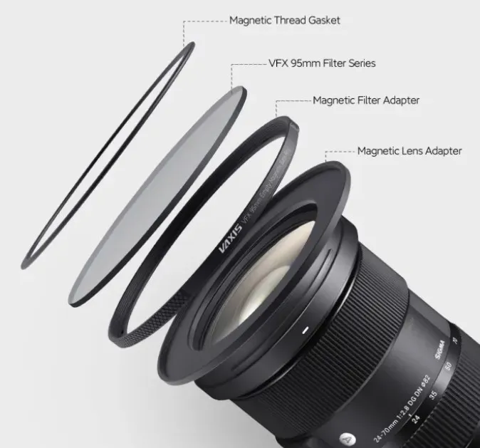 Комплект ND-фильтров Vaxis VFX оснащен магнитным адаптером 72мм,переходным кольцом ,поляризационным фильтром,тремя круглыми стеклянными фильтрами, которые вставляются в круглый фильтровальный лоток матовой коробки. В комплект входят 95-мм фильтры IRND 0.6, IRND 1.2 и IRND 2.1.
